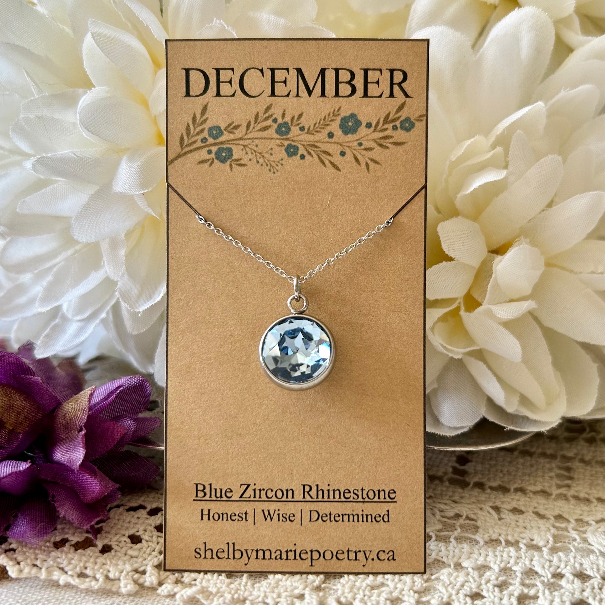 This necklace features a blue zircon rhinestone which is the birthstone for December. It is said that those who are born in December are honest, wise, and determined.