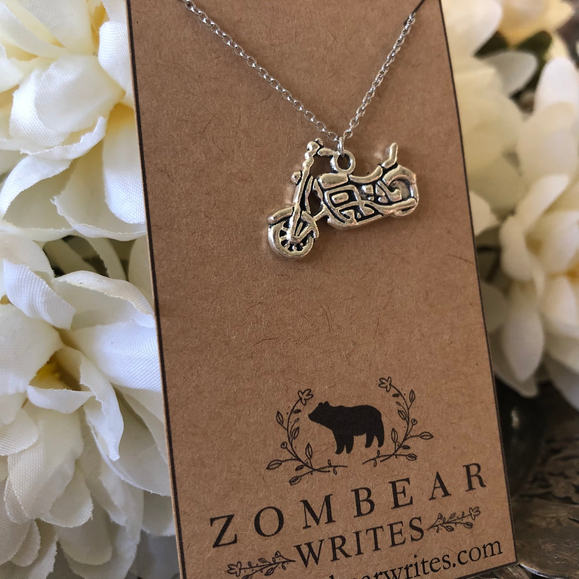 This handcrafted necklace from Zombear Writes features a motorcycle pendant on a durable stainless steel chain.