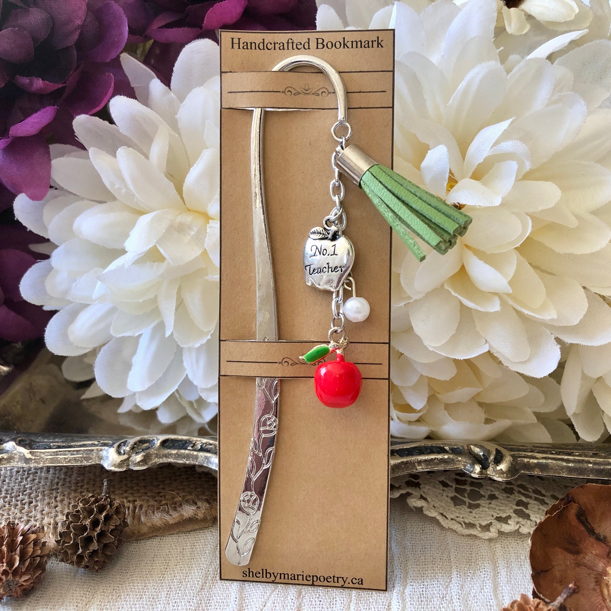 This handcrafted bookmark features a fun apple pendant, a delicate pearl, a charm engraved with "No. 1 Teacher" and a bright green tassel. Place this handcrafted bookmark between the pages of your next great read to save your spot in style!