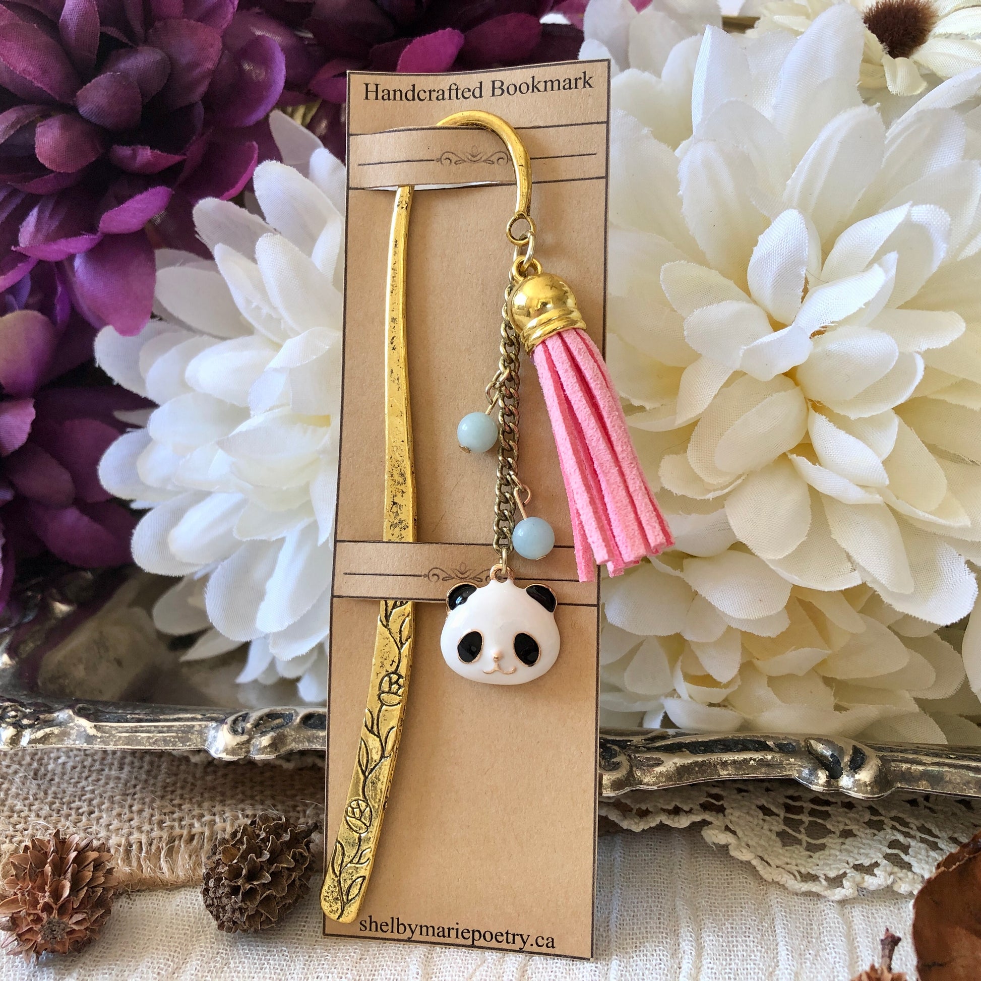 This Panda Bookmark features the most adorable panda pendant, two natural amazonite gemstones, and a pretty pink tassel, all with a unique, rustic gold finish. Place this handcrafted bookmark between the pages of your book to save your spot in style!