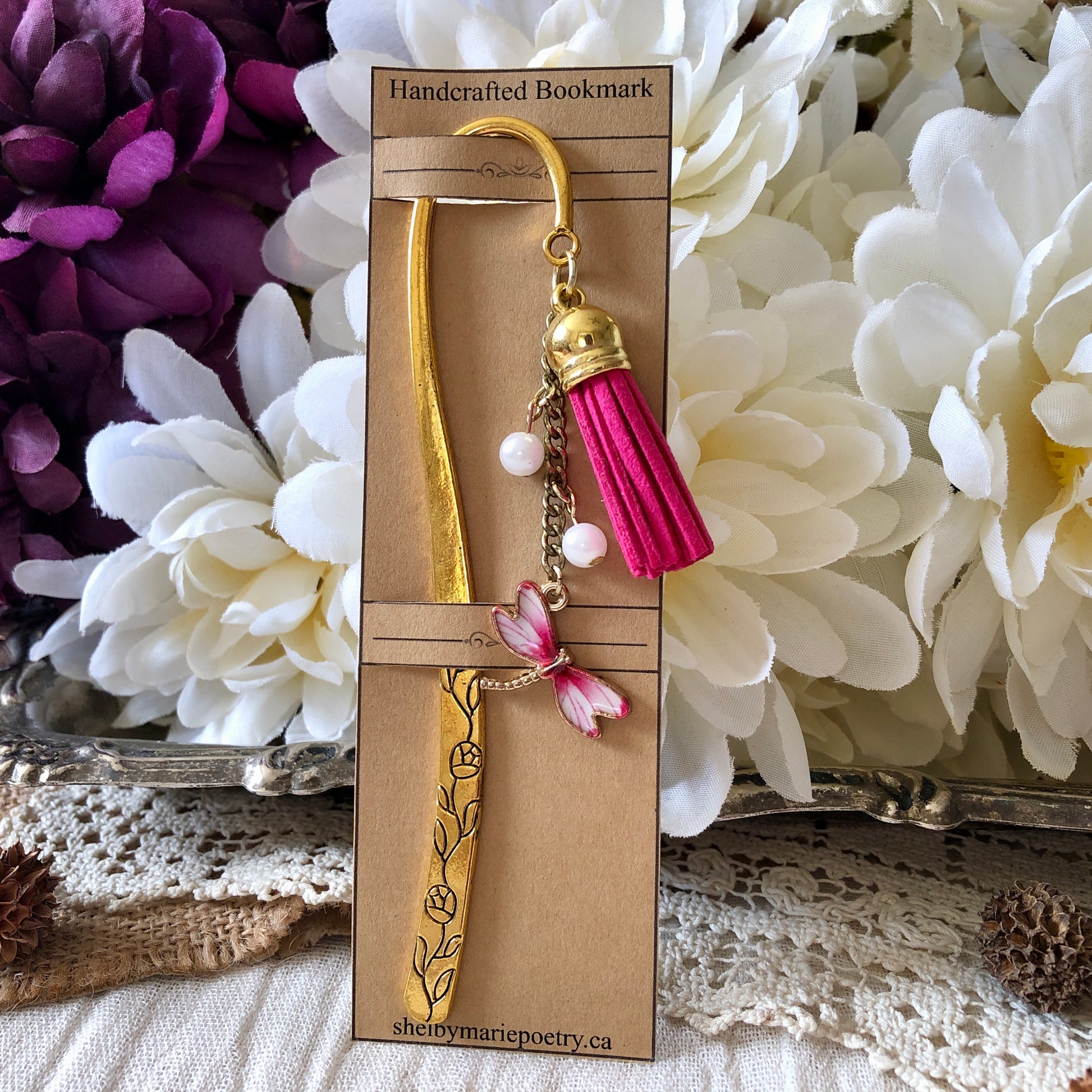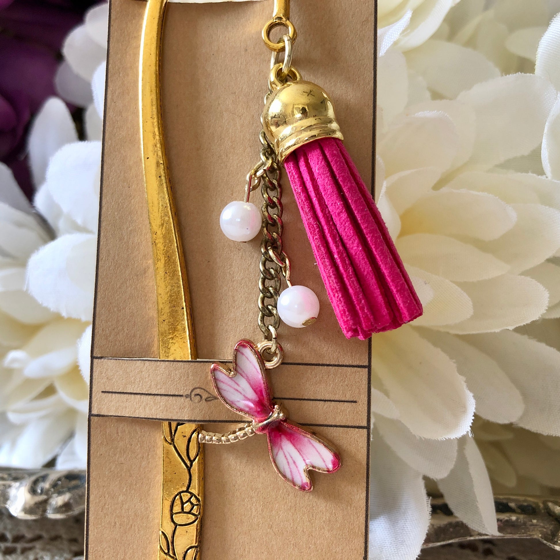 This handcrafted bookmark features a vibrant pink dragonfly pendant, dainty pearls, and a brilliantly bright, matching pink tassel. Place this handcrafted bookmark between the pages of your book to save your spot in style!