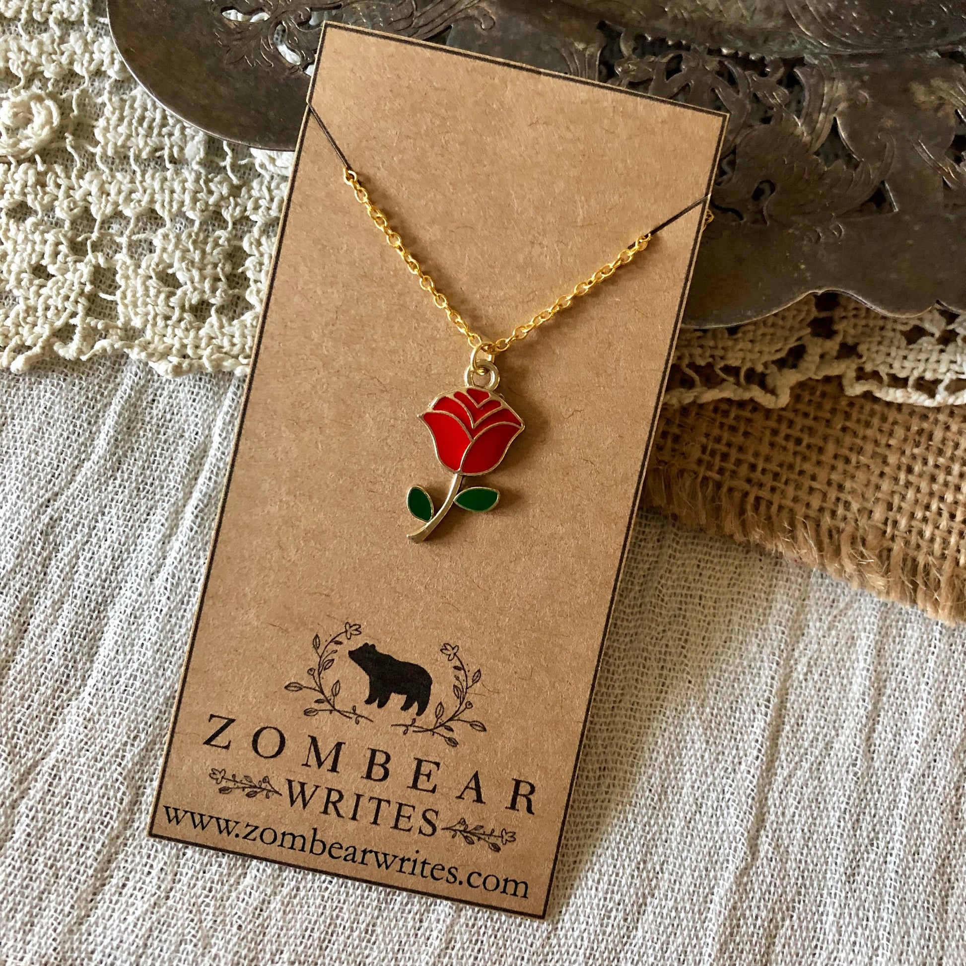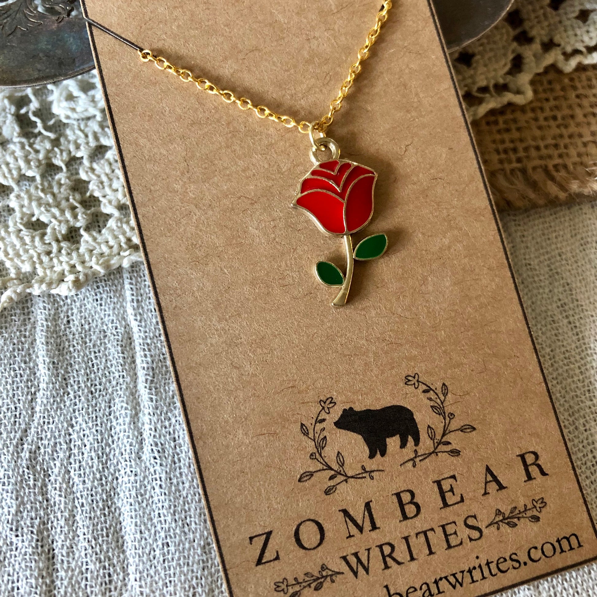 Dream of fairy tales come true while wearing this romantic accessory from Zombear Writes. This necklace features a brilliant red rose pendant on a lightweight chain.