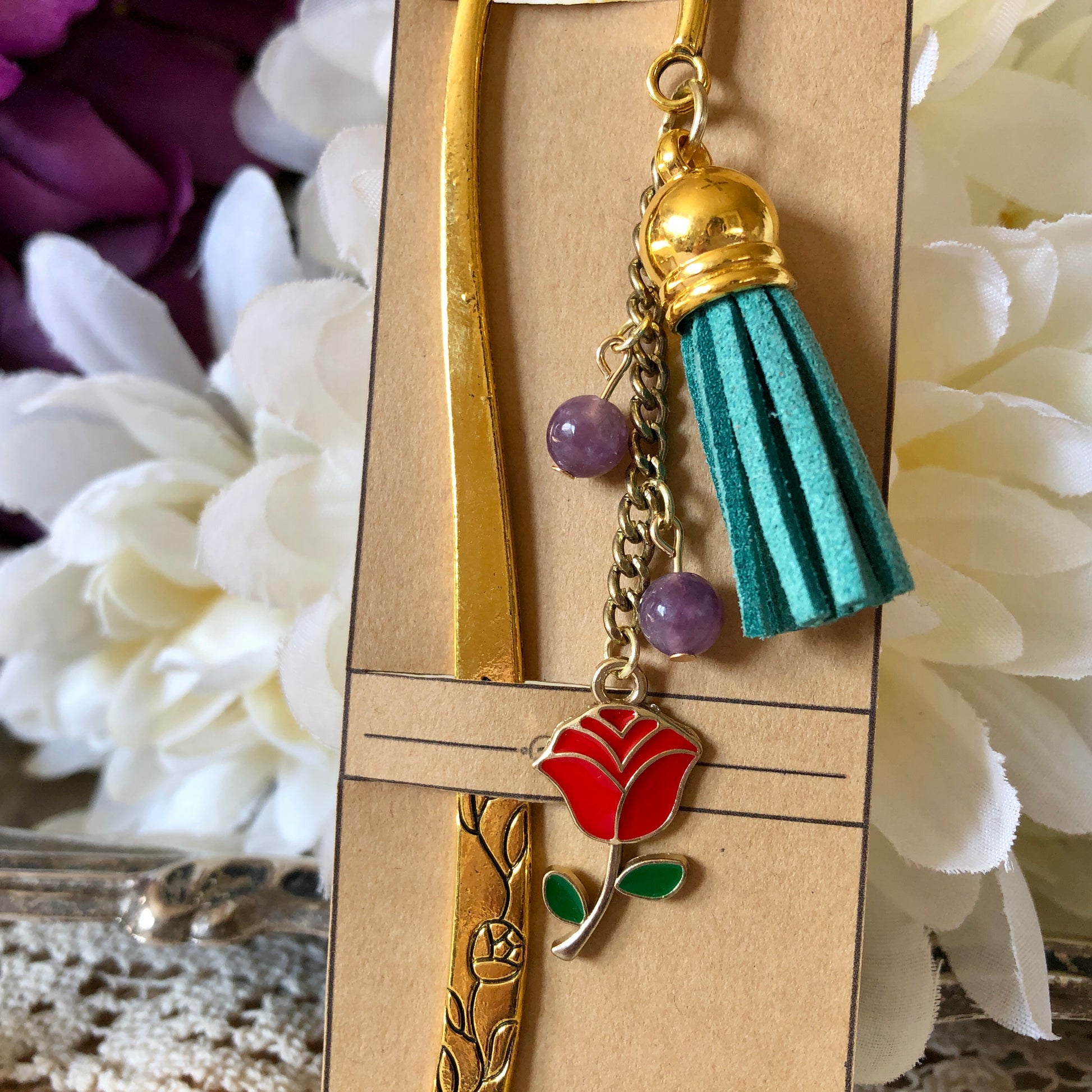 This handcrafted bookmark features a lovely red rose pendant, natural lepidolite gemstones and a soft blue green tassel, all with a rustic gold finish. Place this handcrafted bookmark between the pages of your book to save your spot in style!
