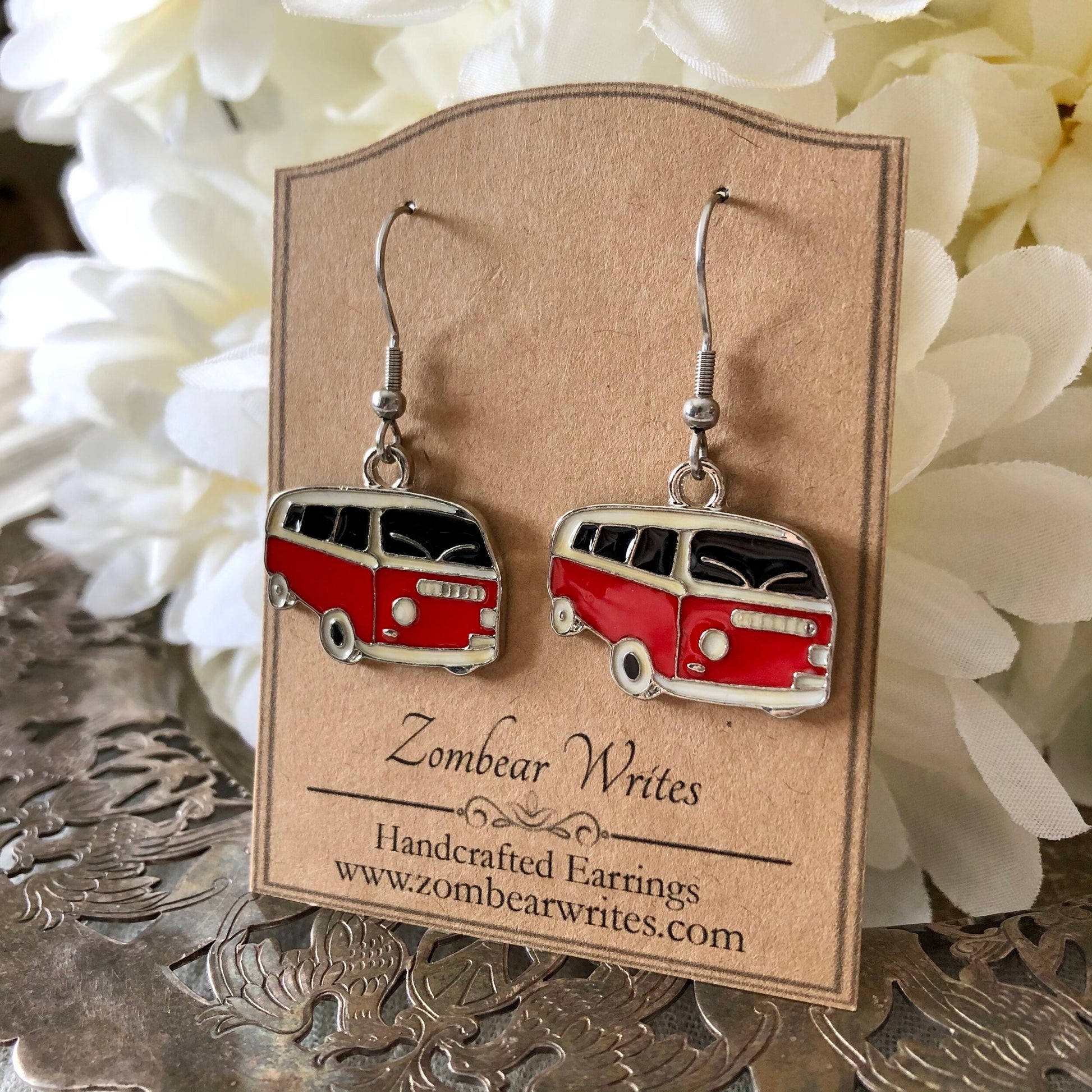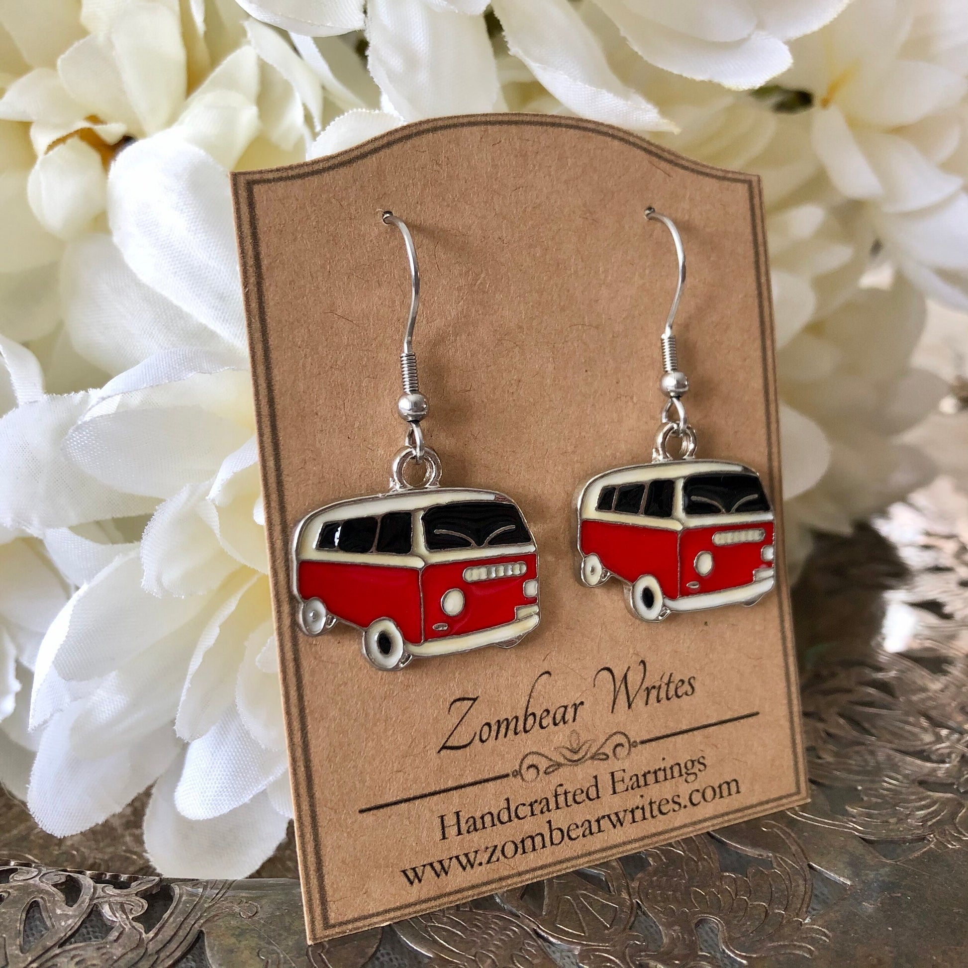 These red van earrings from Zombear Writes are a fun, playful, and wonderfully unique! Wear them to add a pop of colour to your outfit! These earrings are sure to bring many compliments to the wearer.