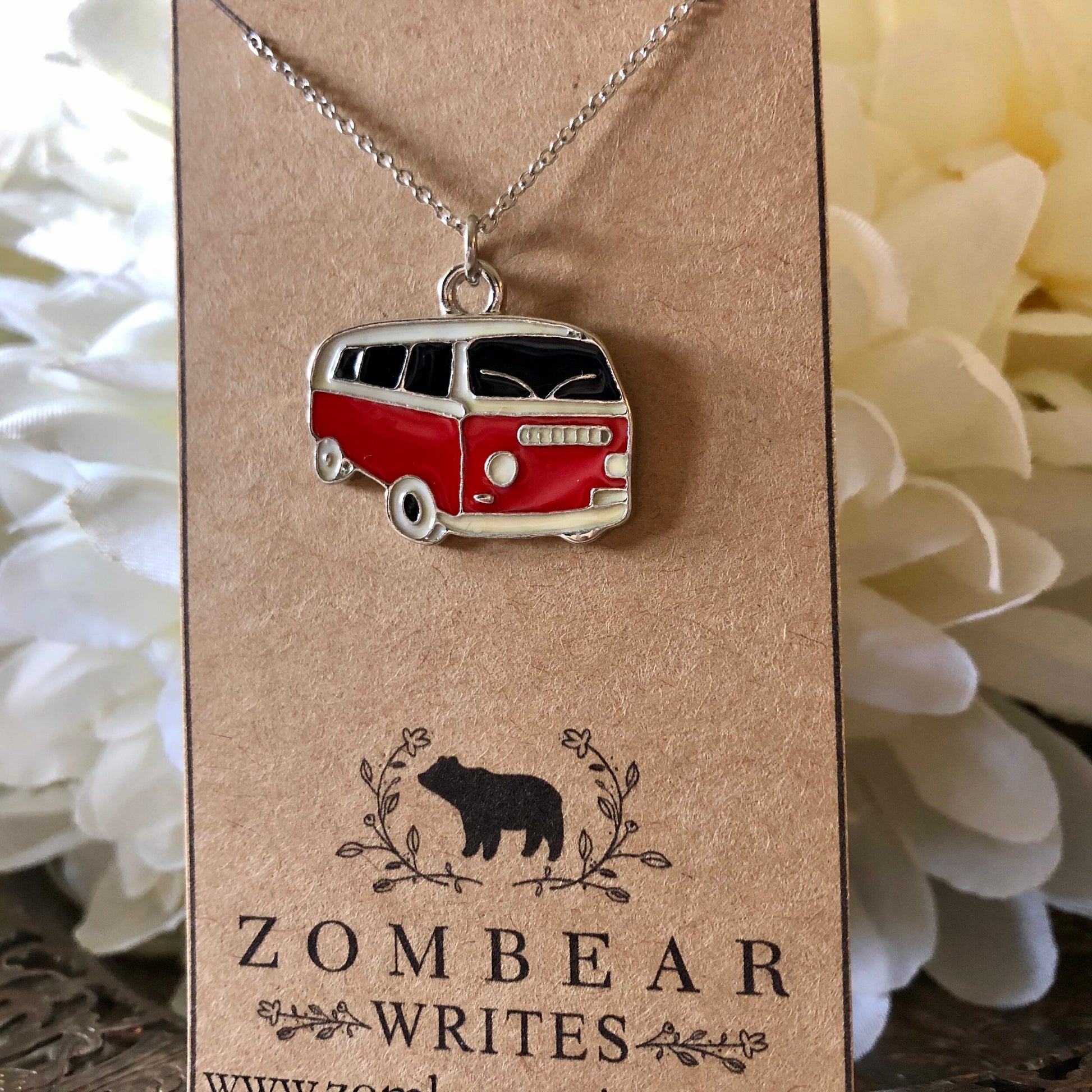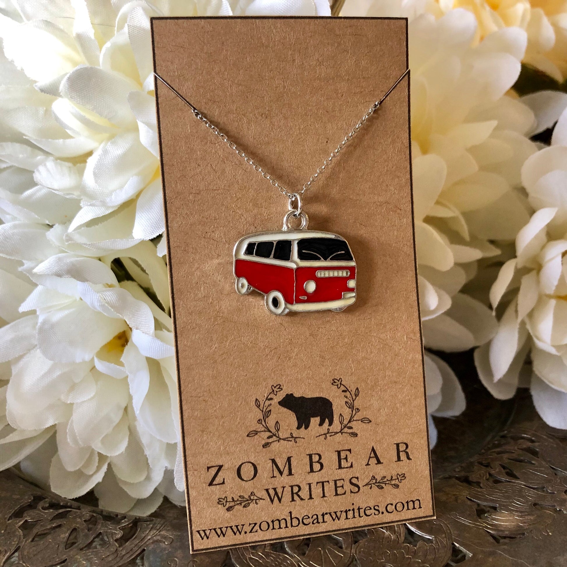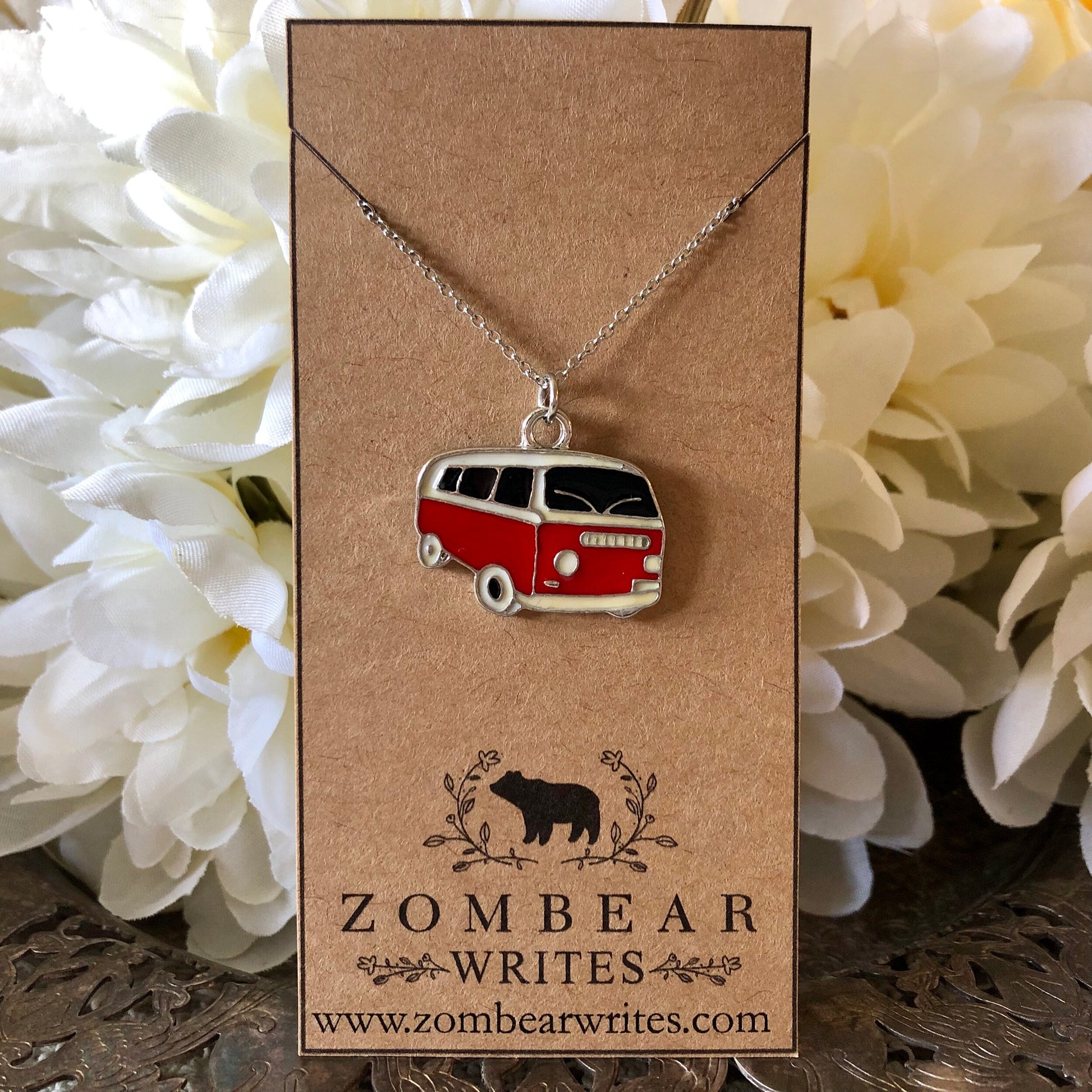 This handcrafted necklace from Zombear Writes features a red van pendant on a stainless steel chain.