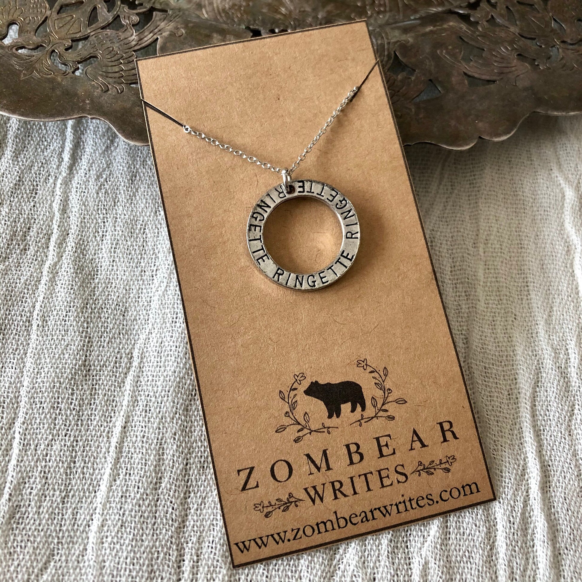 This handcrafted necklace from Zombear Writes is perfect for those who enjoy ringette, it features an engraved pendant with the word “RINGETTE” on a loop to symbolize the ring that is used in game.