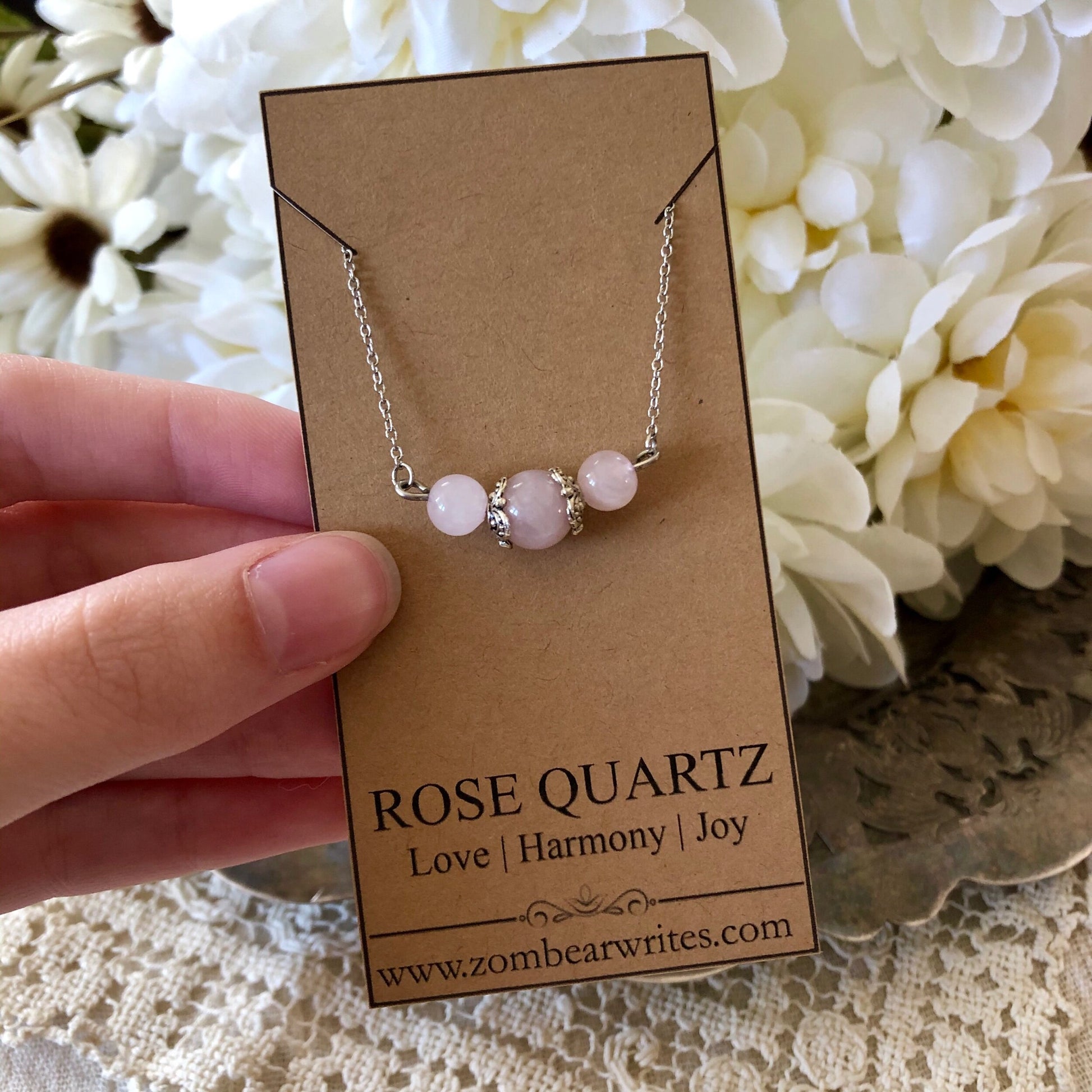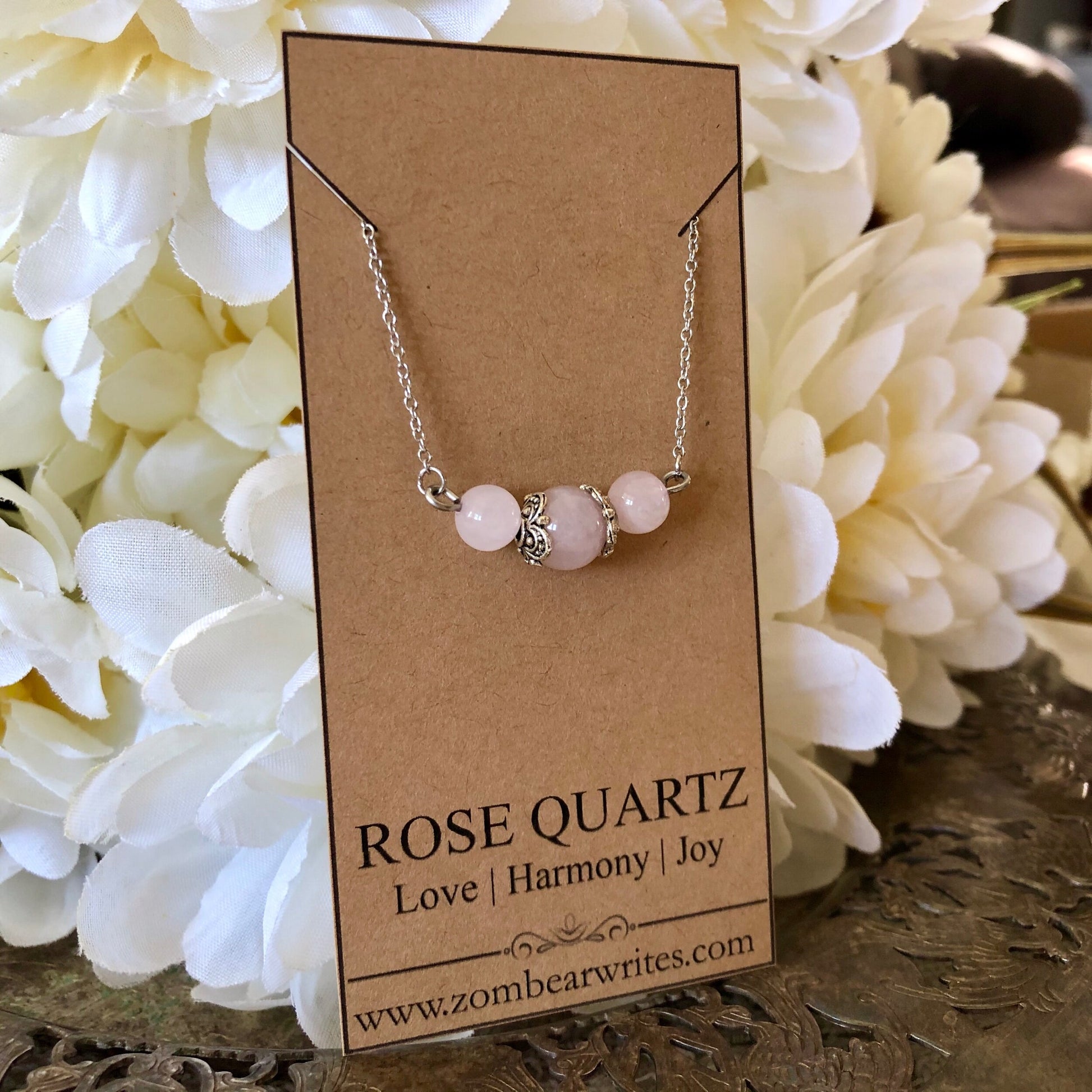 This handcrafted necklace from Zombear Writes features lovely rose quartz natural gemstones. Crafted with stainless steel and pewter, this necklace will not rust or tarnish. Lovely as a unique gift!