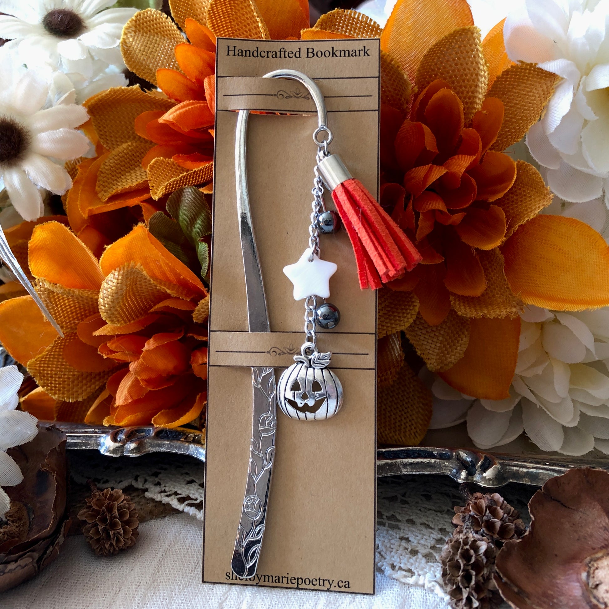 This handcrafted pumpkin bookmark from Shelby Marie is delightful for spooky season! Featuring a cheerful pumpkin, a brilliant star, natural hematite gemstones, and a vibrant orange tassel, this bookmark is just right for fall and Halloween.