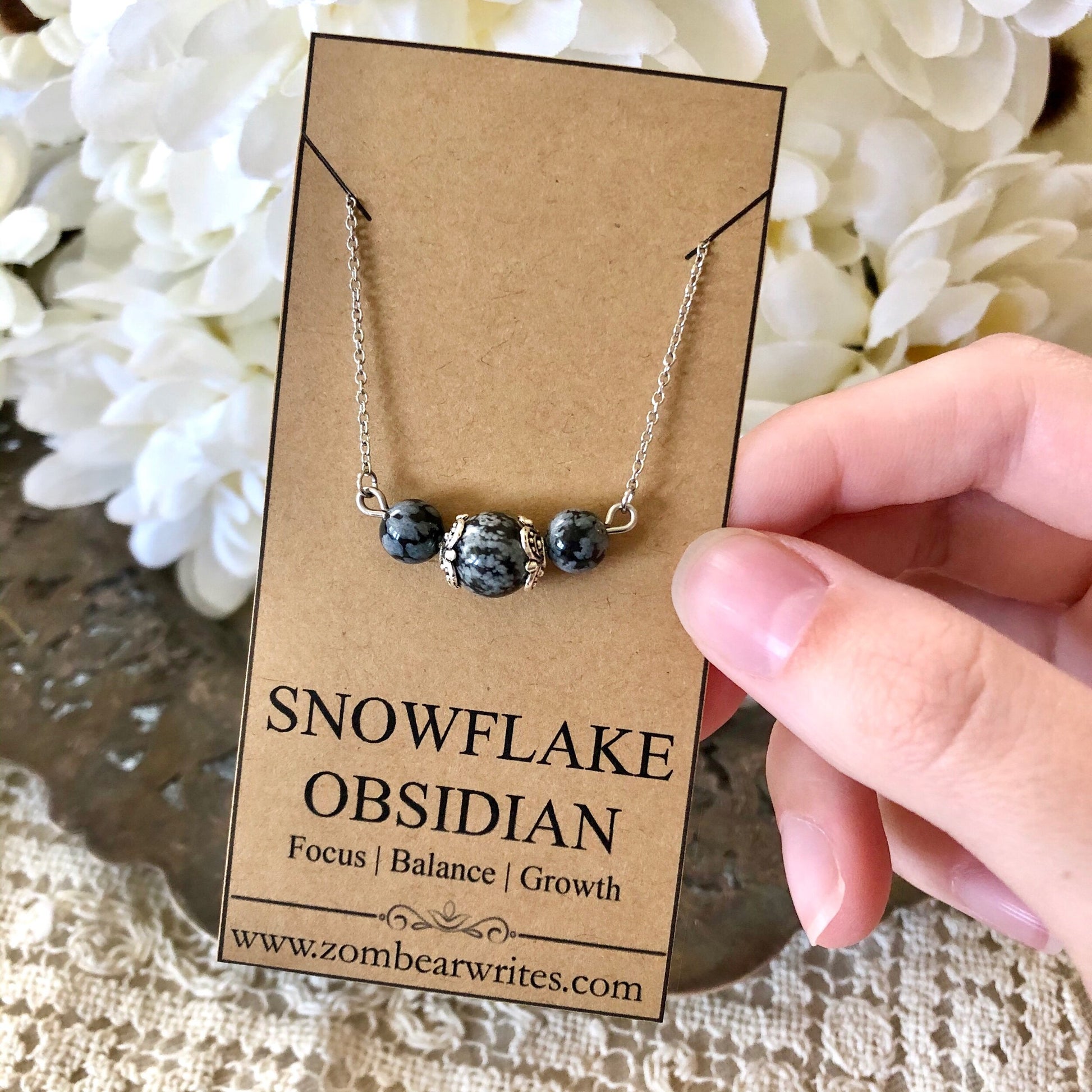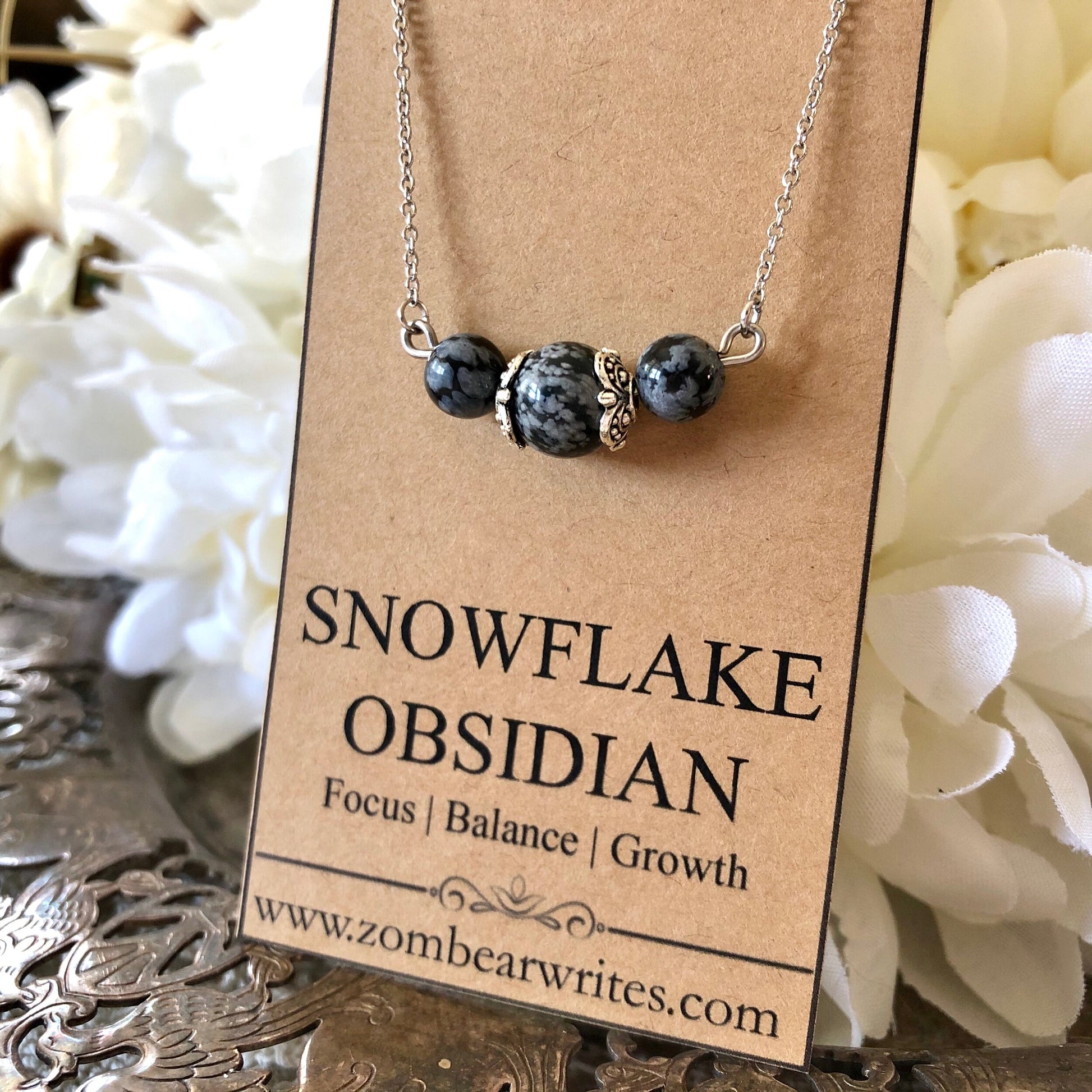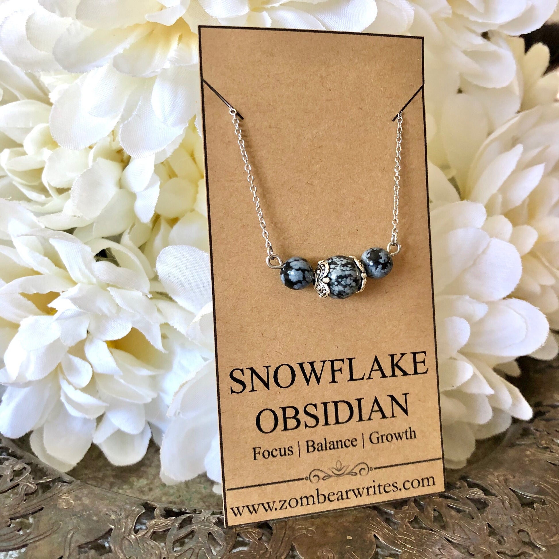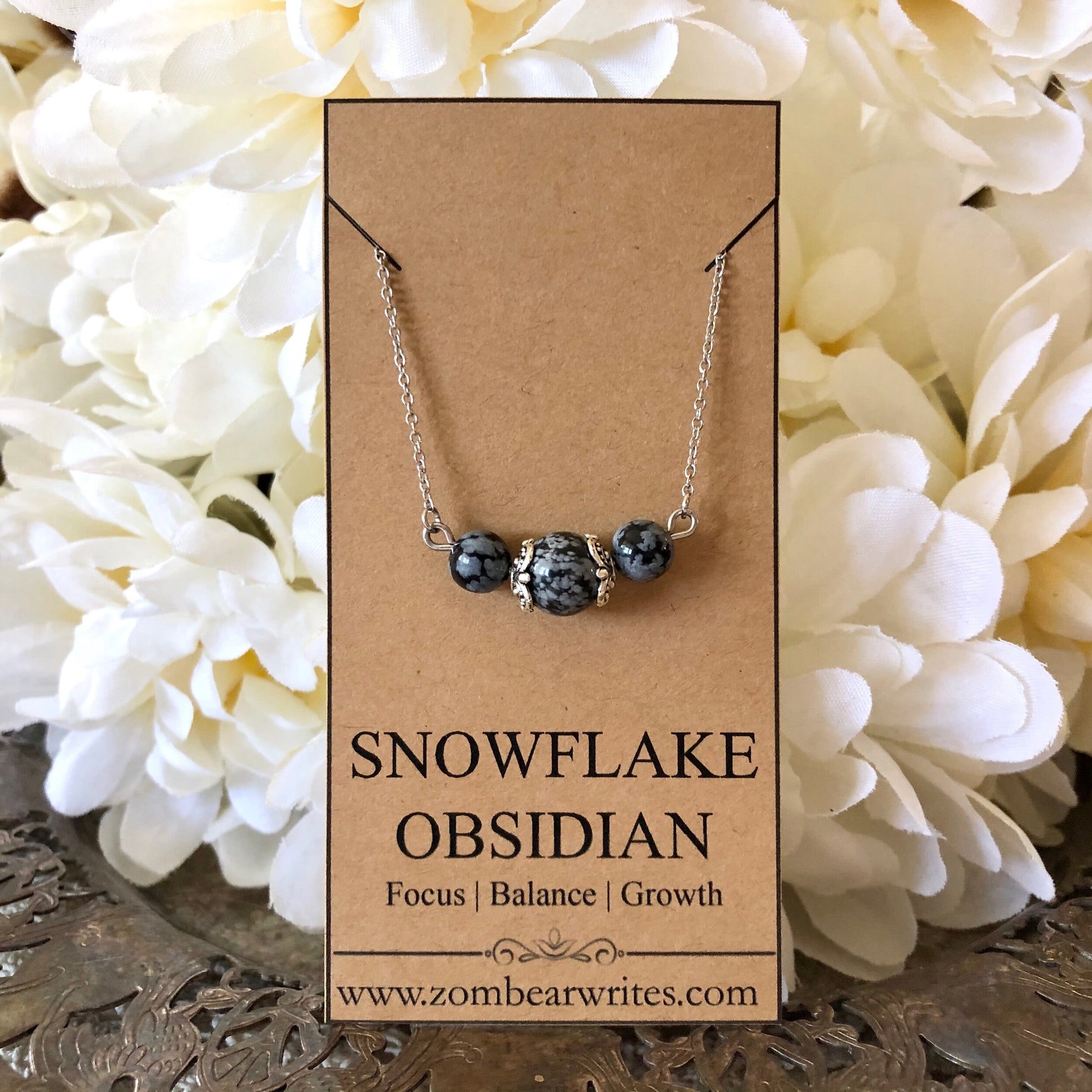 This handcrafted necklace from Zombear Writes features breathtaking snowflake obsidian natural gemstones. Crafted with stainless steel and pewter, this necklace will not rust or tarnish. Lovely as a unique gift!