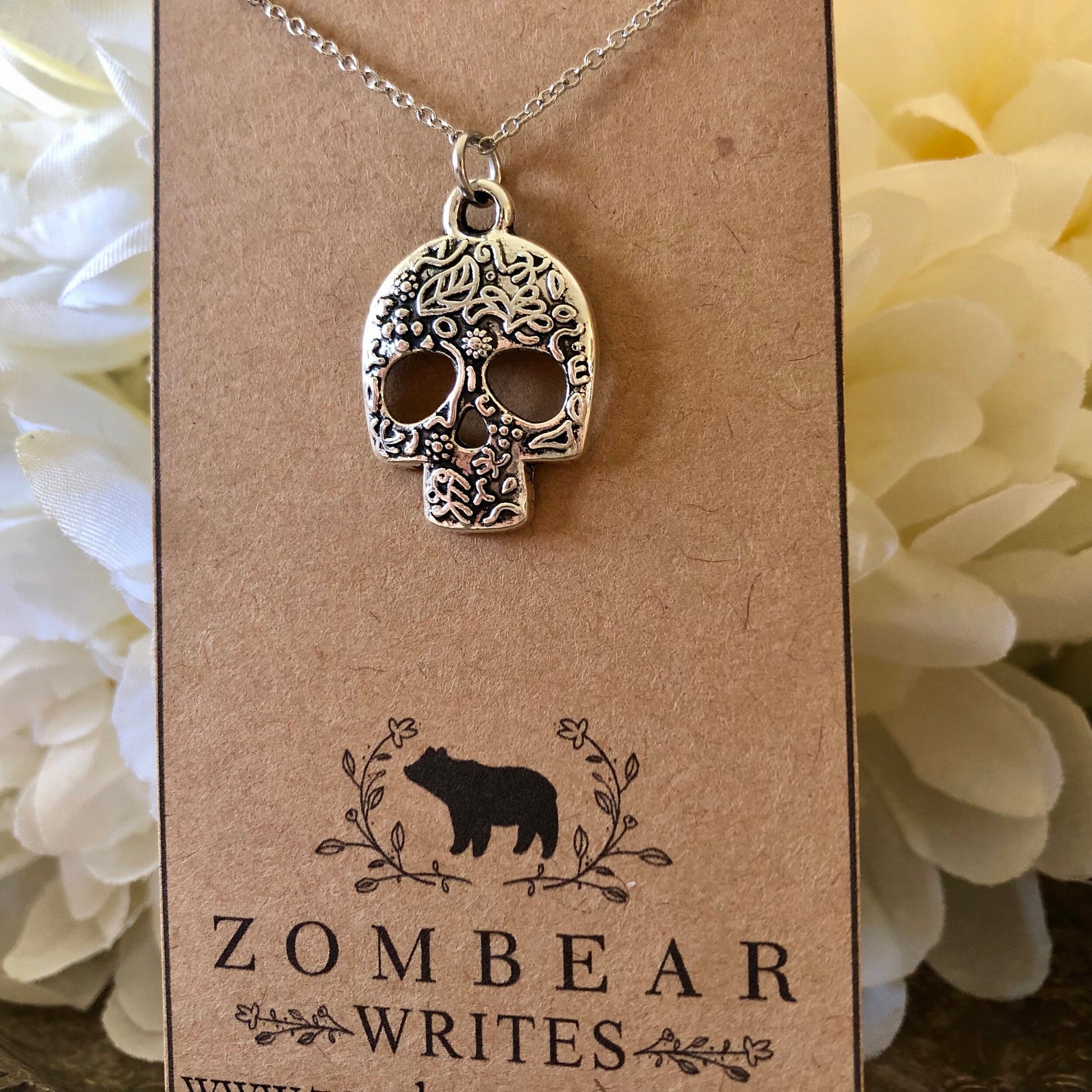 Handcrafted in Ontario, Canada this sugar skull necklace from Zombear Writes is trendy, lightweight and just right for everyday wear. This necklace has been crafted with a stainless steel chain for increased durability.