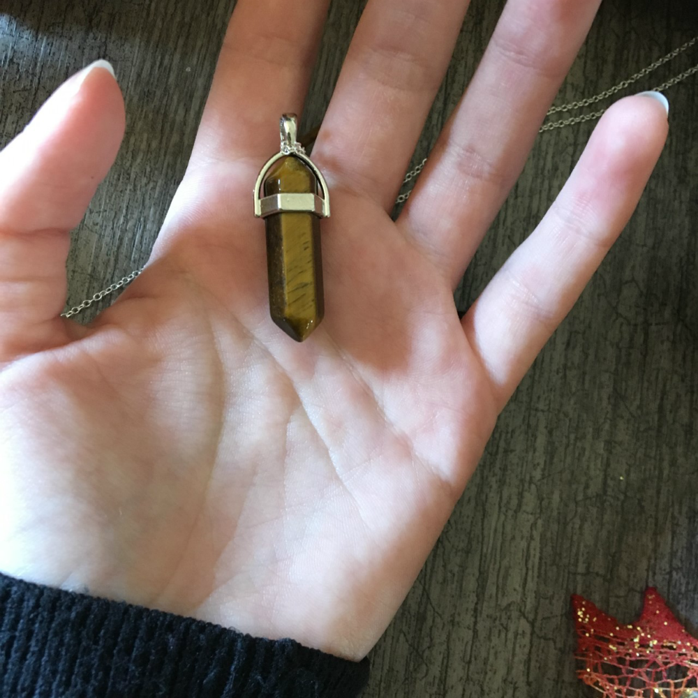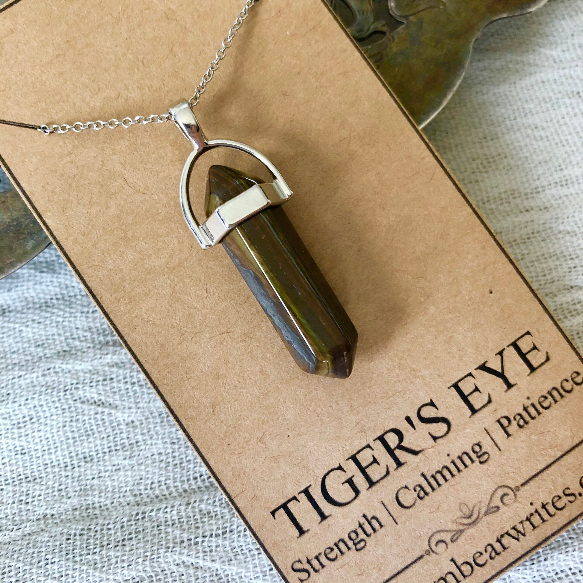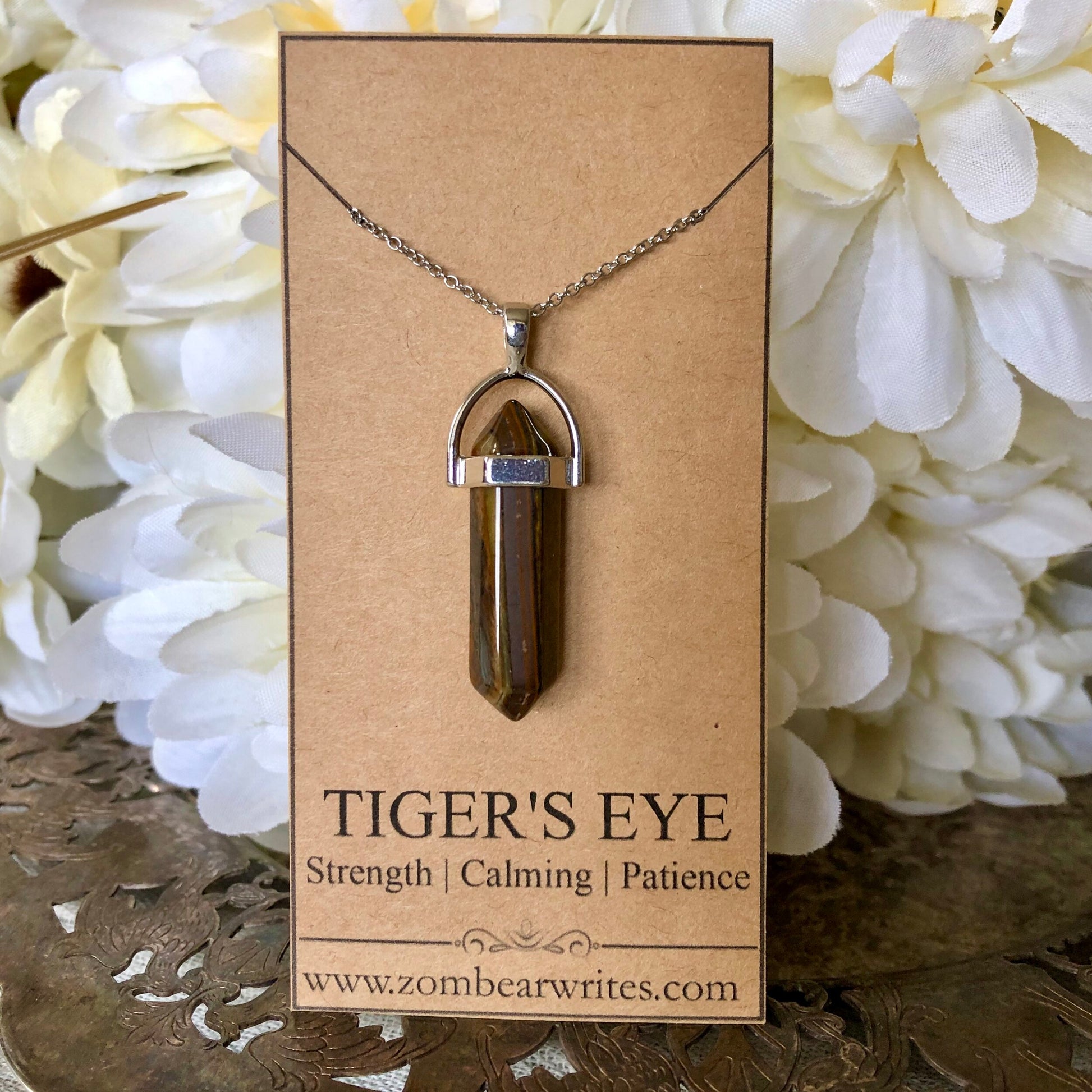 This natural gemstone necklace features a regal tiger’s eye pendant on a stainless steel chain.
