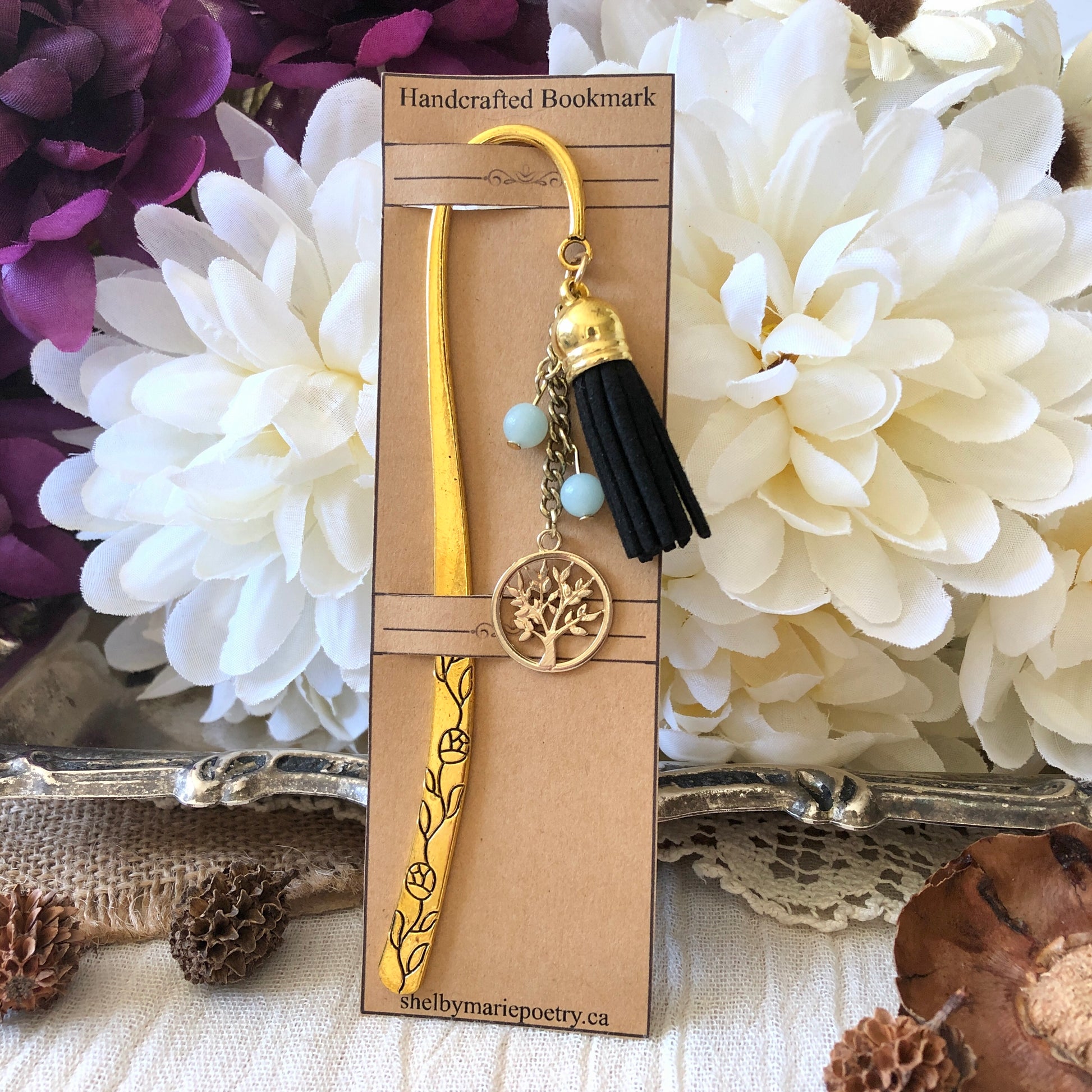 This handcrafted bookmark features an intricate tree of life pendant, natural amazonite gemstones and an elegant black tassel. Place this handcrafted bookmark between the pages of your next great read to save your spot in style!