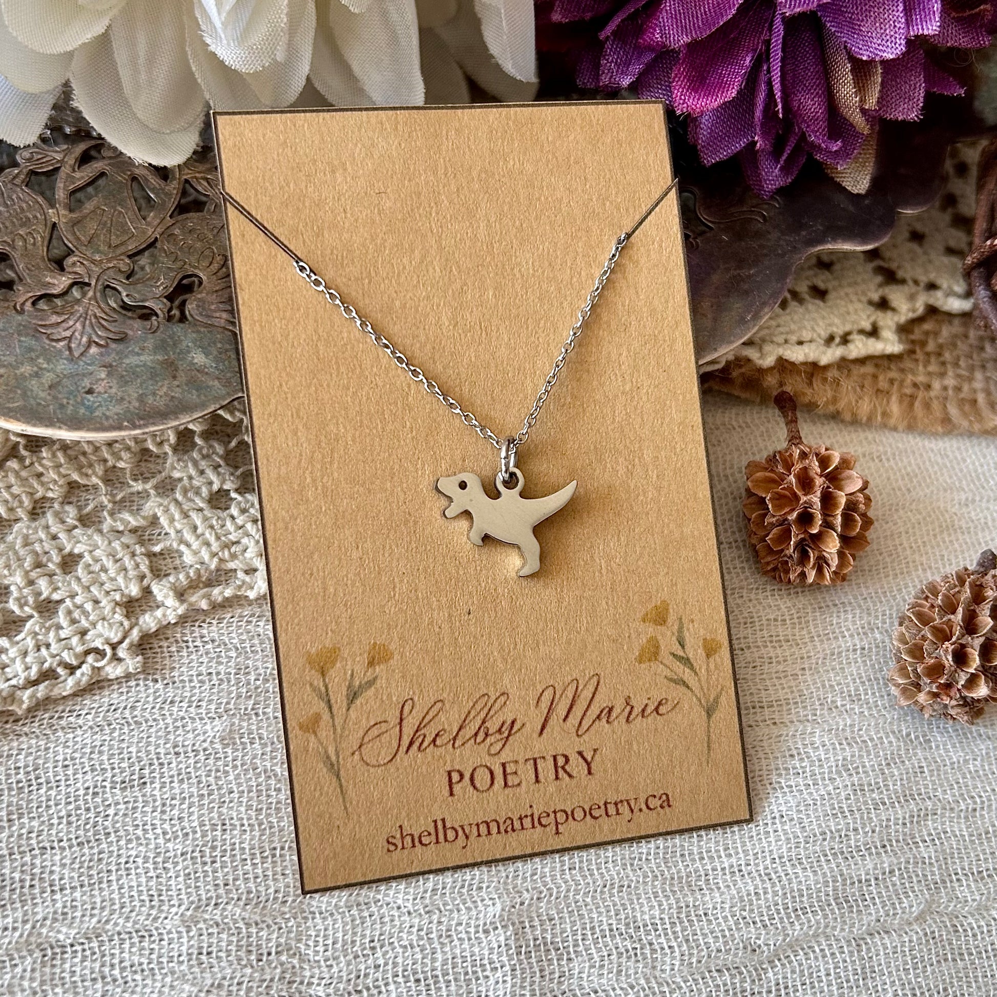 This handcrafted necklace is playful and fun. It features a unique tyrannosaurus pendant and is made of stainless steel which means it will not rust or tarnish.
