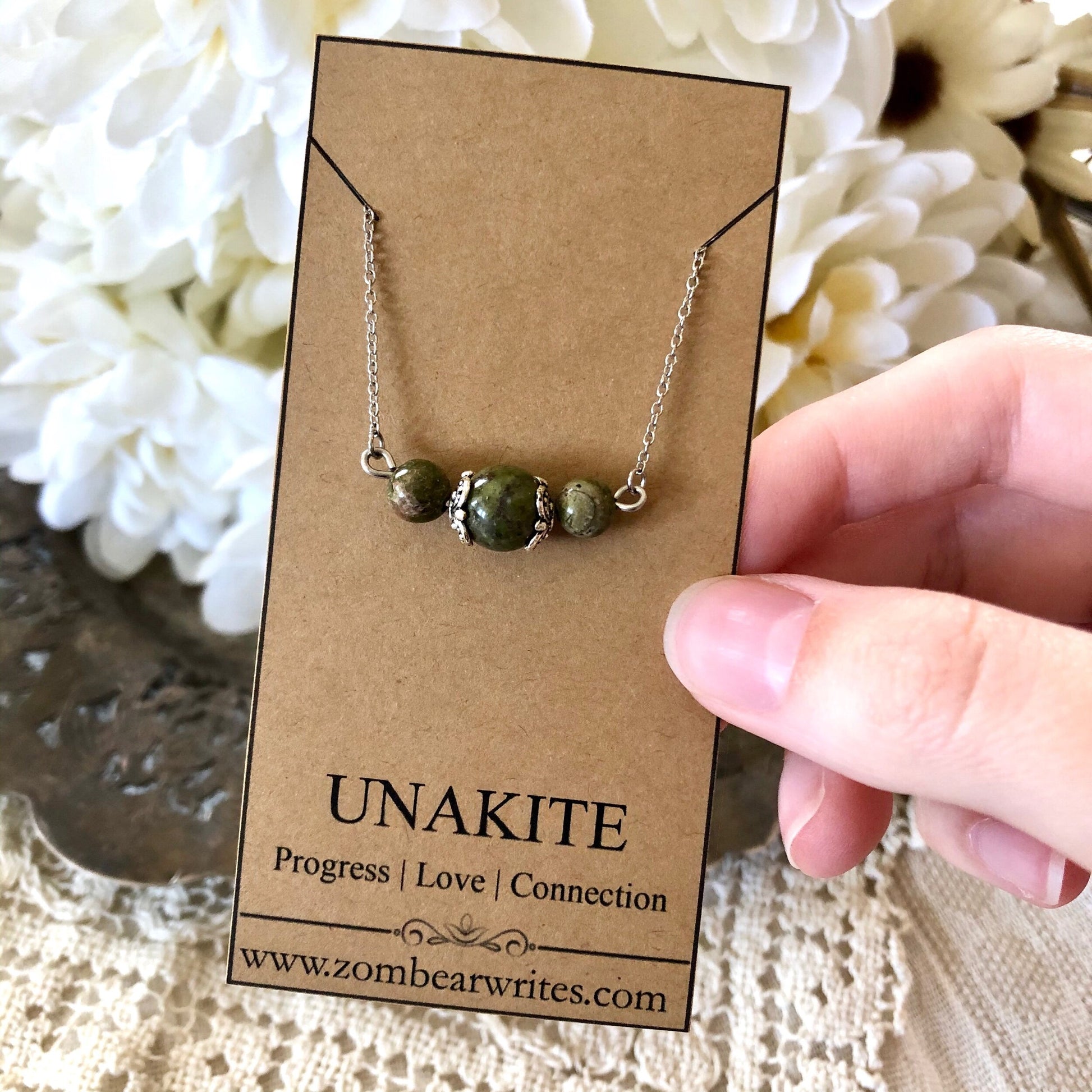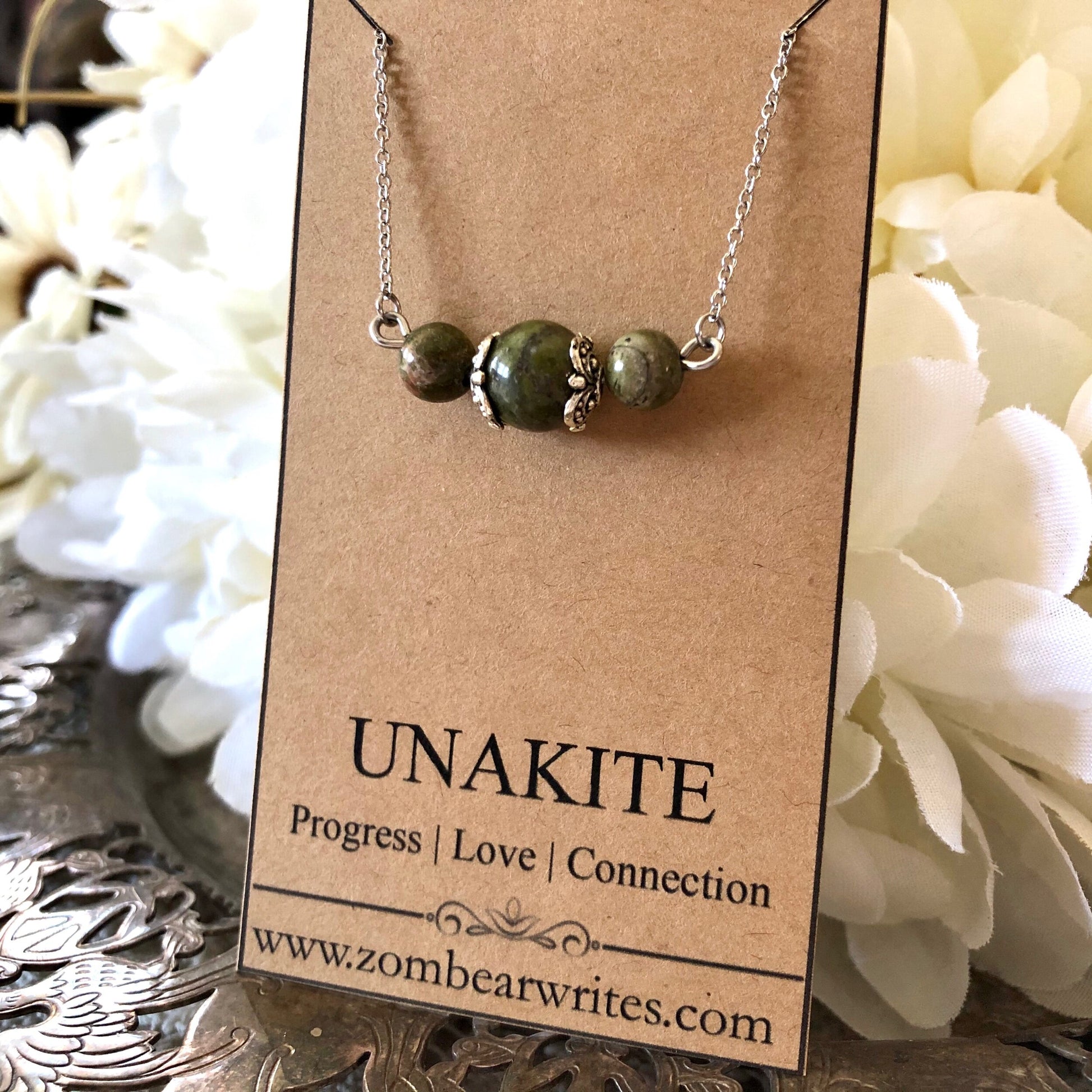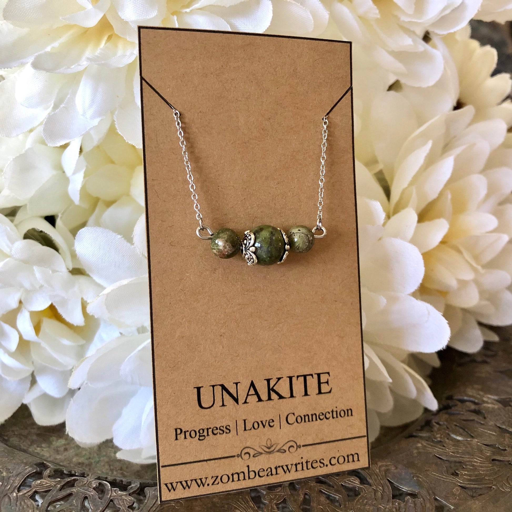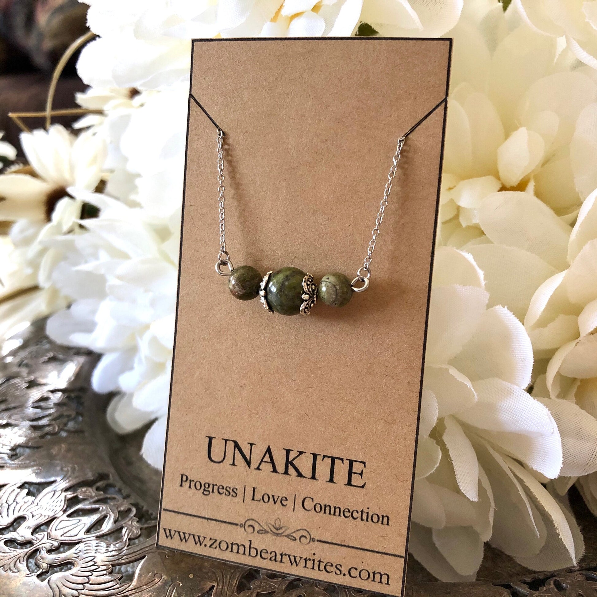 This handcrafted necklace from Zombear Writes features brilliant unakite natural gemstones. Crafted with stainless steel and pewter, this necklace will not rust or tarnish. Lovely as a unique gift!