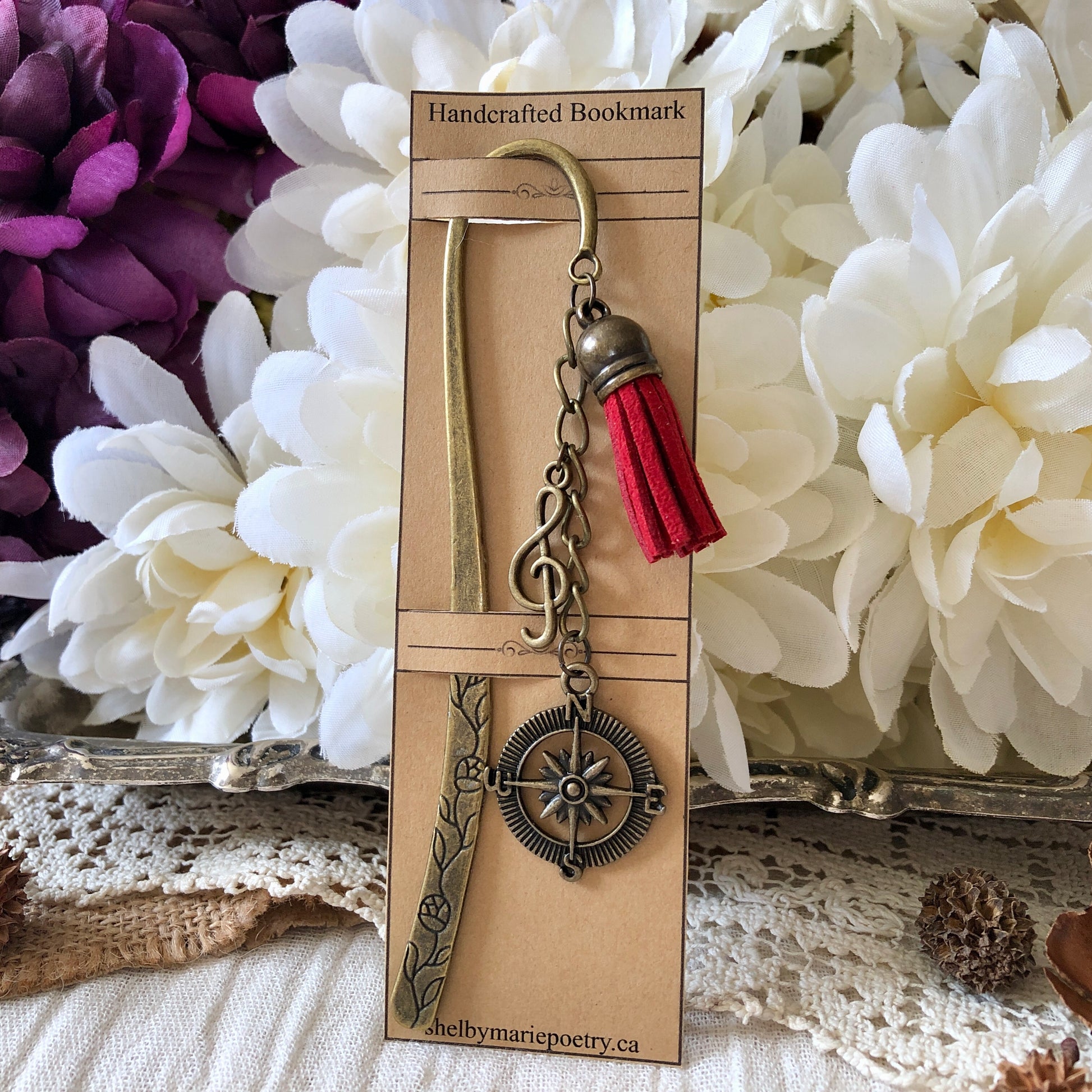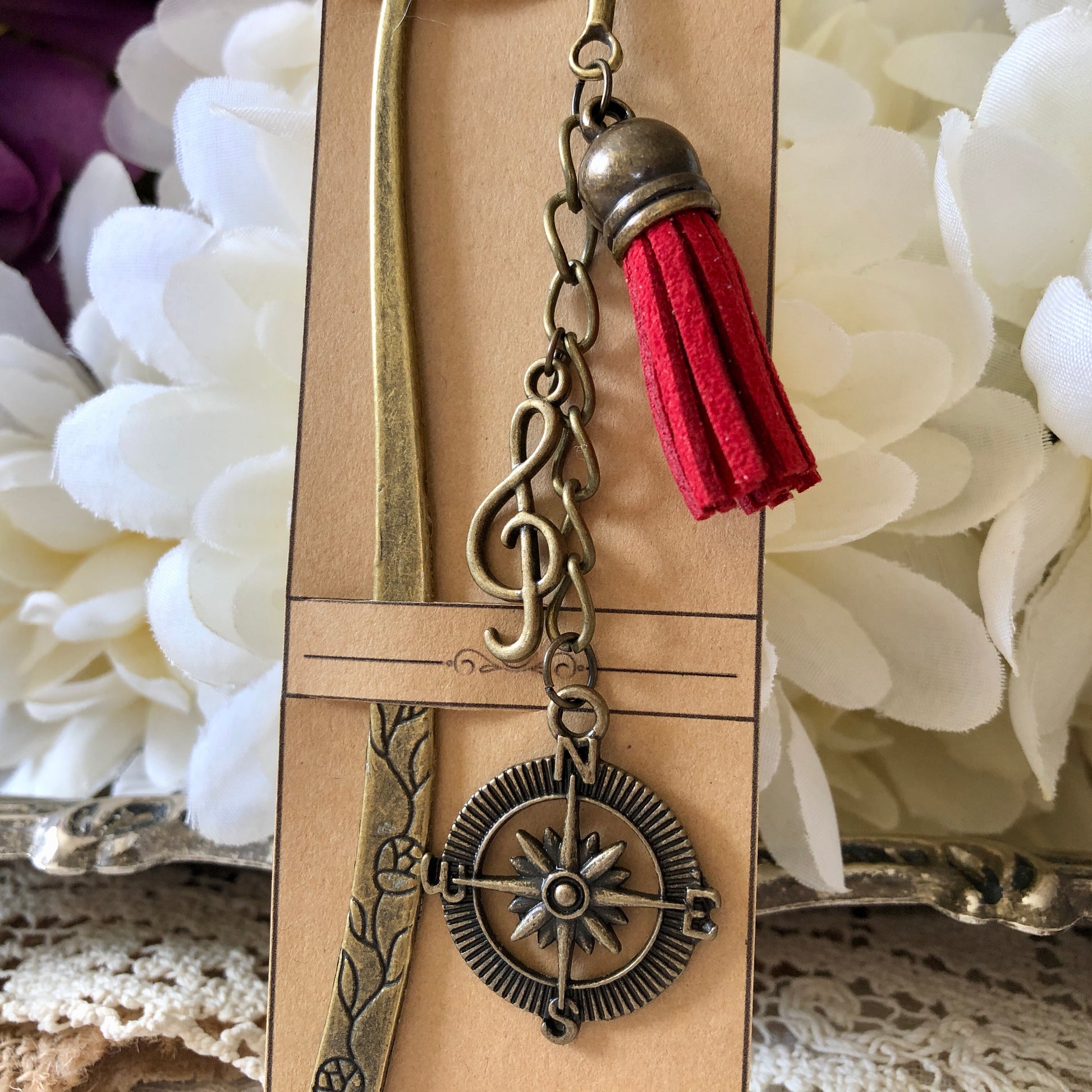 This handcrafted bookmark features a stunning compass pendant, a treble clef and a deep red tassel, all in a rustic bronze finish. Place this handcrafted bookmark between the pages of your book to save your spot in style!
